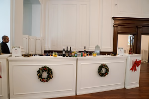 One of our portable bars setup with wreaths for a holiday party in our ballroom