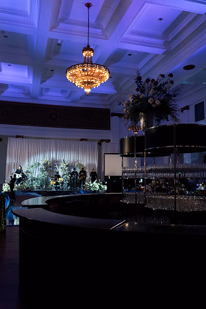 A black circle bar with glassware in the center overlooks a stage in the ballroom.