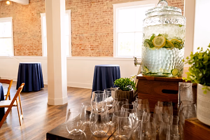 A drink station with Spa water and glassware on our wooden bar in the Parlor. Natural lighting and exposed brick walls create a great ambiance for daytime events!