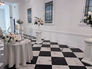 Elevated florals and a guestbook greet guests in the black and white foyer as they prepare to enter the Sanctuary for a ceremony and reception