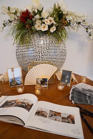 A guestbook setup on a round table in our entry foyer creates a place to share photos, highlight memories, and allow guests to leave messages
