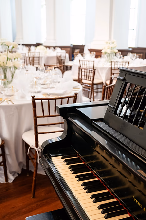 Photo of a concert grand piano next to tables setup for a wedding reception