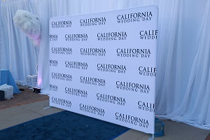 A blue carpet to match the "Sky is the Limit" theme leads to a step and repeat with a white draped backdrop for California Wedding Day