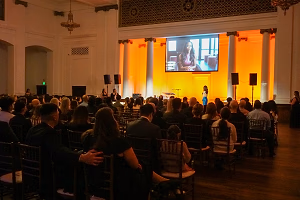 A presentation with hundreds of chairs setup theater-style viewing a large stage and a large suspended projector screen in our large ballroom