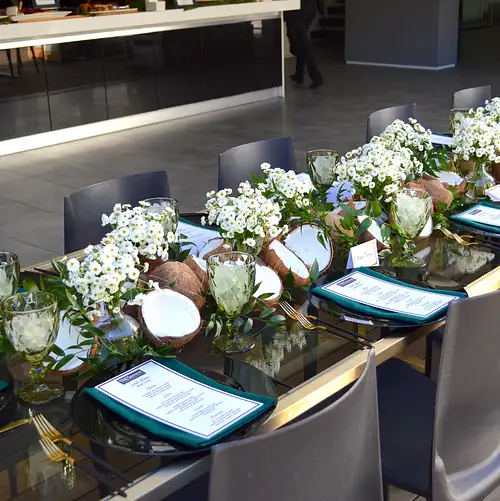 Table setting with elegant flower arrangements and coconut halves, each seat showcasing the menu